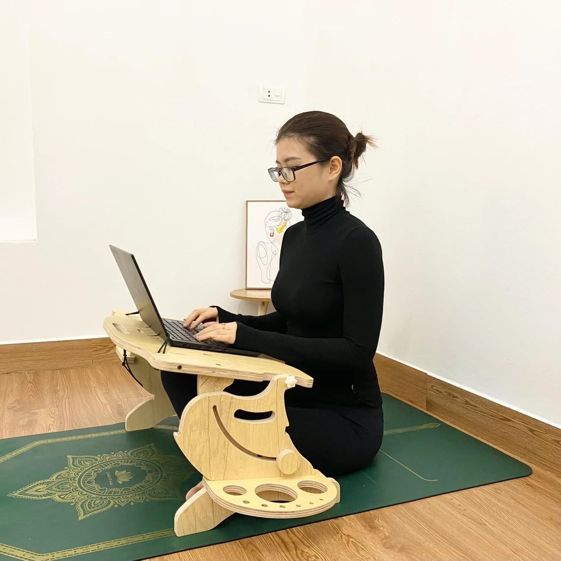Easy Tilt Adjustment From 0 - 90°: With the left and right rotation button, you can easily adjust the tilt angle from 0-90°, allowing you to sit in many different positions such as reclining or in bed, sofa, floor... Helps To Relax The Spine: Our desk is the only one on the market that allows you to use your laptop while lying down. It helps you relax your spine comfortably after long periods of laptop use. Hold The Laptop Tightly: The laptop is fixed with a lower support bar and an upper wire, ensuring the laptop is held firmly and cannot fall. The desk is designed to hold up to 40 lbs, making it able to accommodate even the heaviest laptops. Made From Wood Material: The environmentally friendly material is very durable and can be easily reused. It helps protect your health and is safe for children. Cup Holder And Mouse Pad: The cup holder allows you to easily place your water cup or snack bowl while you work without fear of spilling. The touchpad can be installed at two levels, high and low, helping to work comfortably in both sitting and lying positions. Suitable For Both Right-handed And Left-handed Users: If you prefer to use the mouse with your left hand, you can remove the mouse pad and attach it to the other side for ease of use. In conclusion, our Lap Desk Designed for Lying Down Sitting Posture is the perfect accessory for those seeking ergonomic comfort and relaxation while using their laptop. With its comfortable design, adjustable features, and convenient extras, it is sure to enhance your productivity and provide a more enjoyable computing experience. NOTE: The product has been copyrighted. Any form of copying violates the law and can be sued in court. NOTE: If you still find your laptop feels too far away, you can use the Laptop Stand Lowering Kit. Simply click on the store to find and purchase it for a more comfortable working experience. Note: If you have a larger waist size, please contact us. We can customize the desk to fit your measurements for optimal comfort. NOTE: Because the table has many details, some details of the table may be missing during the packaging process. If you receive an item and find it is missing, please message the shop before leaving feedback so we can send you the missing parts for free. Thanks a lot FAQ: Question 1: Hello! When lying down, is there a way to lock the laptop's position? I am concerned that the laptop might fall on my face Answer: We fixed the laptop in 2 positions. 1 is equal to the bottom edge of the table. 2 is by a wire. and the lap top is held in a very solid position and cannot fall down Question 2: Could you please could give me the dimensions of the product? Answer: Dimensions of the table after installation are 20 x 24 x 15 inches Question 3: Hi, does the desk work in all positions between lying and sitting or only at the two extremes? How does it lock in place? Answer: Hello, our table has a tilt adjustment button and allows you to sit in most positions such as lying, sitting, or reclining. Question 4: I find my laptop desk too far away from me. What should I do to bring my laptop closer? Answer: You can use the Laptop Stand Lowering Kit. This product adjusts the height and position of your laptop, bringing it closer to you for a more comfortable working experience without needing to change your desk.