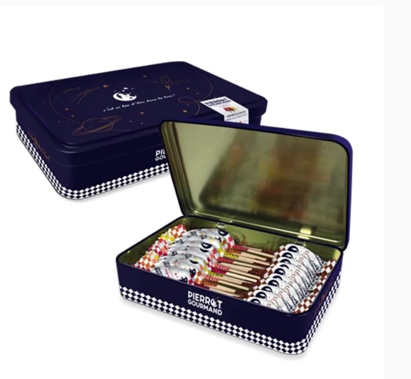 Inside reusable tin, you’ll find 10 fruity-flavored gourmet lollipops and 10 creamy fresh milk caramel lollipop. All natural. Imported from France.
