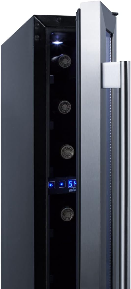 Summit Appliance SWC007 Commercial 6" Wide ADA Compliant Built-in Undercounter Wine Cellar with 7 Bbottle Capacity, Glass Door, Black Cabinet, Auto Defrost, Digital Thermostat and LED Lighting Designed for built-in installation, the SWC007 features a front-breathing compressor-based cooling system. The stainless steel trimmed glass door includes a pro style handle and is user-reversible for added flexibility. The sealed back and right angle plug make it easy to install flush with cabinetry. Key Features: - Unique 6" width lets you transform the smallest space into convenient wine storage and display - 32 1/4" height allows placement under most ADA compliant counters - Front-breathing design for built-in installation - Stainless steel trimmed glass door provides full product visibility - Digital thermostat offers precise and convenient temperature control Specifications: - Height of Cabinet: 32.25" - Width: 5.88" - Depth: 20.75" - Depth with Handle: 22.38" - Depth with door at 90°: 25.5" - Bottles: 7 - Defrost Type: Automatic - Door: Glass - Cabinet: Black - US Electrical Safety: ETL - Canadian Electrical Safety: ETL-C - Amps: 1 - Voltage/Frequency: 115V AC/60Hz - Weight: 40 lbs. - Shipping Weight: 42 lbs. - Number of Zones: 1 - Door Swing: RHD - Height Adjustable: Yes - Thermostat Type: Digital - Interior Light: Yes - Fan Type: Interior and Exterior - Refrigerant Type: R600a - Refrigerant Amount: 0.57 oz. - High Side PSI: 270 - Low Side PSI: 105 - Interior 1: 25.75"x3.5"x14.25" - Compressor Step: 3.5"x5" - Level Legs: 4 - Temperature Range: 41 to 72ºF - Sabbath Mode: Yes