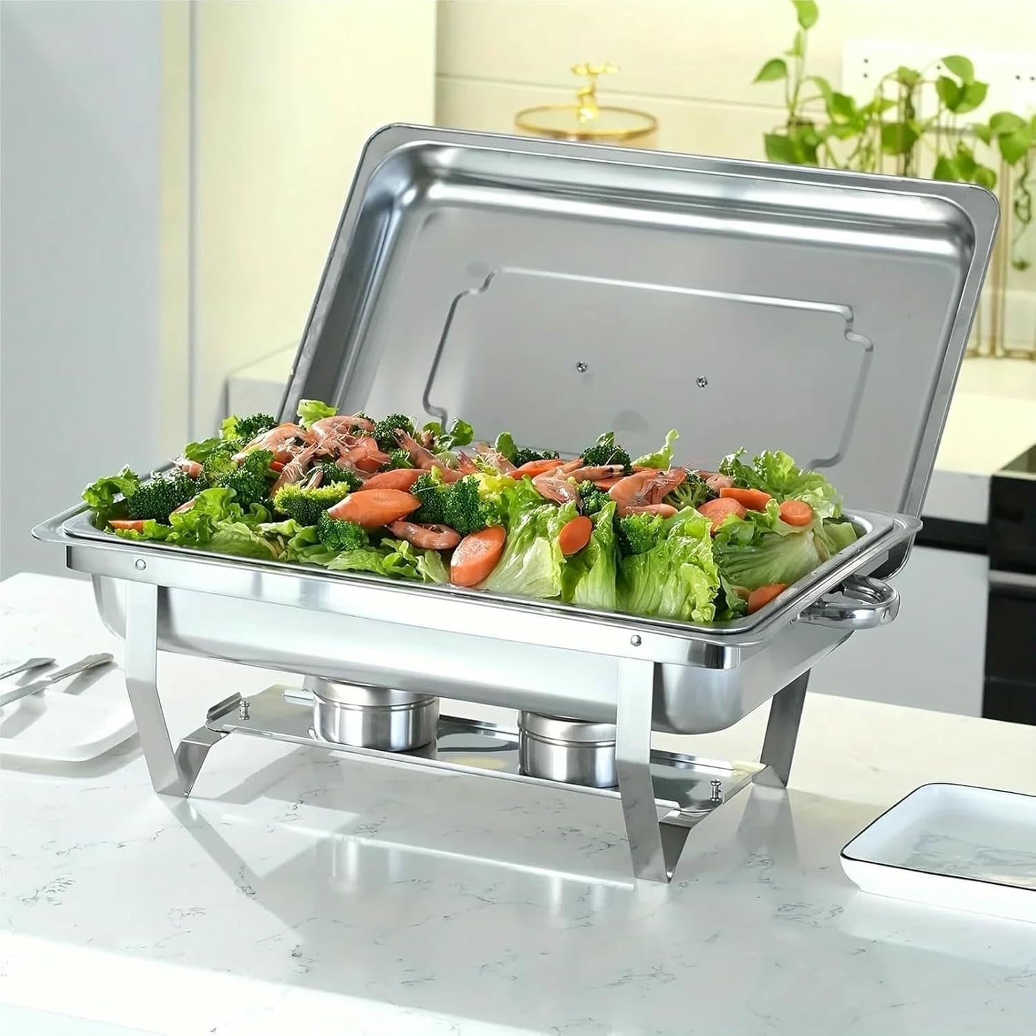 Reliable Heat Retention: This chafing dish buffet set ensures your food remains at the optimal serving temperature, making it ideal for catering events, parties, and family gatheringsVersatile Usage: The stainless steel buffet warmer chafers are perfect for a variety of dishes, from appetizers to entrees, providing flexibility for buffet-style dining experiencesEffortless Cleaning: With a sleek, smooth surface, these chafing dishes for buffet can be easily wiped clean, making post-event cleanup swift and uncomplicatedConvenient Design: Designed for easy setup and breakdown, this stainless steel chafing dish buffet set offers practicality and efficiency for catering professionals and home users alikePerfect for Any Occasion: Whether hosting a wedding, corporate event, or holiday celebration, this chafing dish set is a functional choice for seamlessly serving large groups