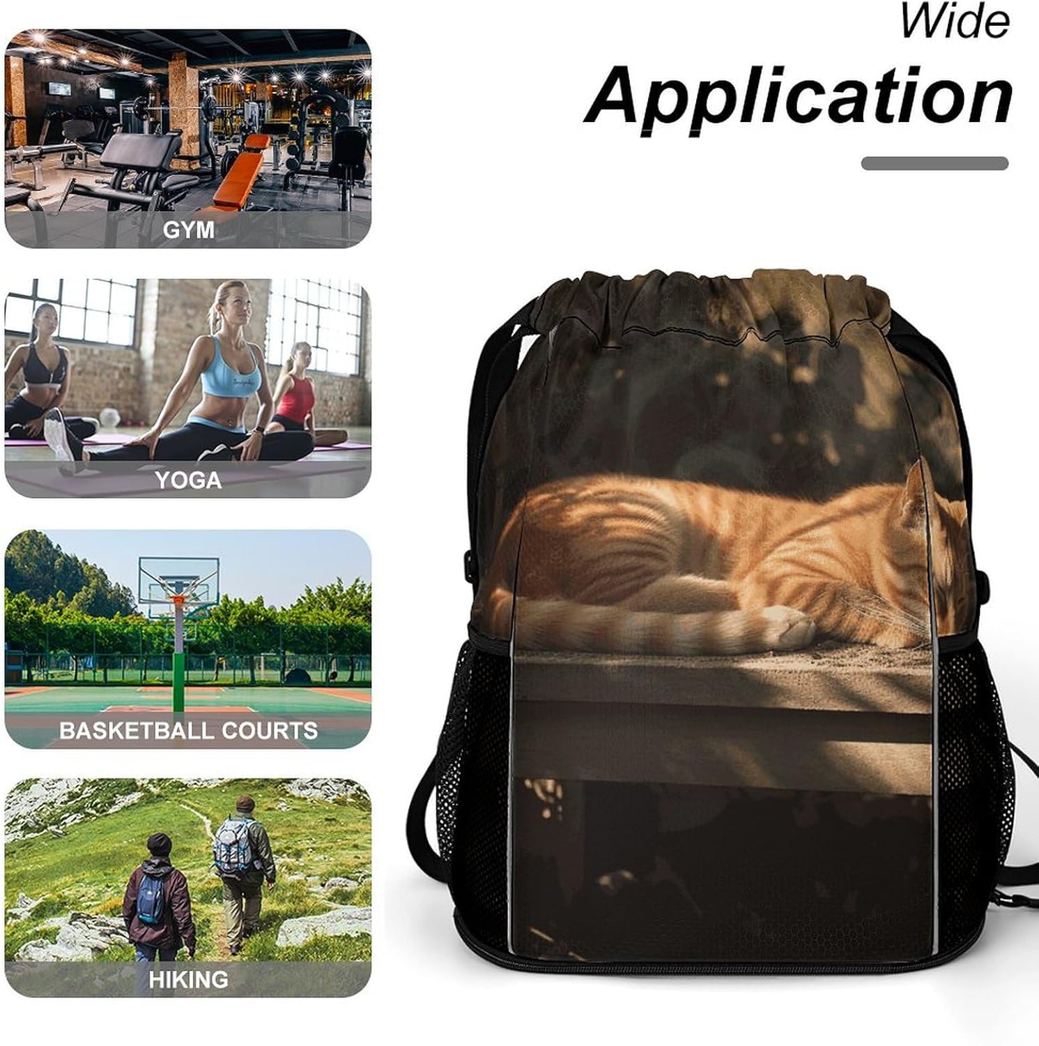Ideal for athletes, travelers, and commuters, this drawstring backpack combines ruggedness with durability, and features a unique wet-dry separation design for sweaty sportswear or wet swimsuitsThis Orange Cat Sleeping drawstring gym bag is also super waterproof, which can prevent items in the bag from getting wet and accidentally spilling on rainy days, making it premium for outdoor adventuresThis light backpack has a large capacity that can accommodate 2 pairs of shoes, 3 sets of gym clothes, and 1 bottle of water. If you are traveling, you can pack clothes, toiletries, and a tablet while separating wet swimsuits. For daily use, the stylish design easily transitions from the office to the gymThis workout bag is easy to care for and is machine washable (air drying recommended). Reinforced pressure points ensure it can be used for a long time