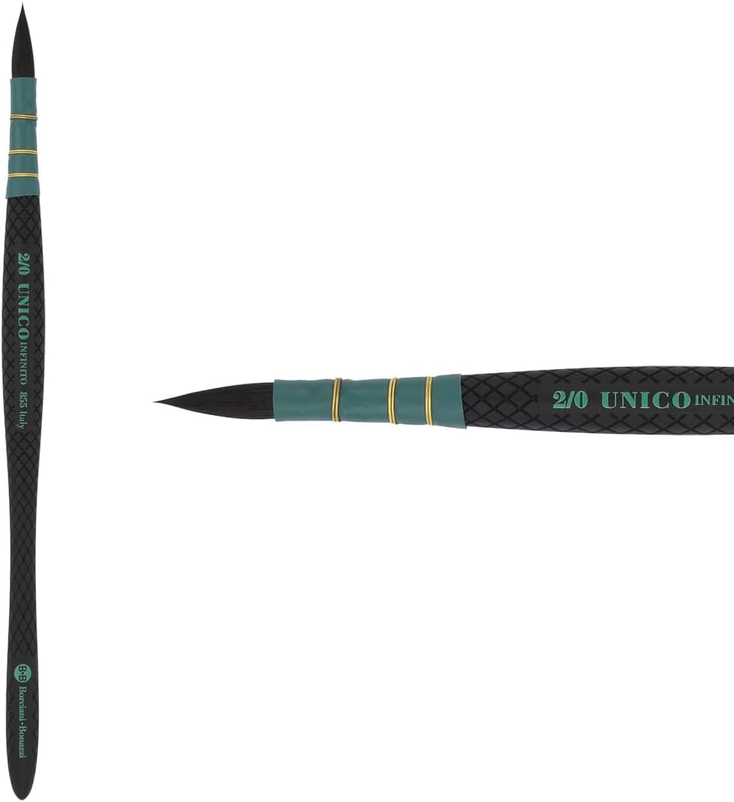 Introducing the Infinito Synthetic Quill brush by Borciani e Bonazzi, a pinnacle of craftsmanship in the realm of professional watercolor brushes. Designed for the discerning artist, this exquisite tool combines elegance, functionality, and innovation to elevate your watercolor artistry to new heights. Handcrafted in Italy by skilled artisans, each brush embodies the rich heritage and precision synonymous with Borciani e Bonazzi. The Infinito Synthetic Quill features patented Hidro synthetic hair, a breakthrough in brush technology that mimics the absorbency and softness of natural sable brushes. These synthetic watercolor brushes are engineered to deliver unparalleled performance, allowing artists to achieve both intricate details and broad washes with ease. The highly absorbent bristles are designed to release color slowly, providing a consistent and smooth application that professional watercolor brushes demand. The distinctive quill shape is one of the standout features of this watercolor brush. It expands under pressure, offering expressive strokes that are ideal for a variety of techniques, from calligraphy and script to free-flowing line work. The flame-shaped quill tuft is highly responsive, making it perfect for both fine details and sweeping washes. Available in three distinct shapes—quill, mini quill, and quill liner—this watercolor brush set caters to the diverse needs of watercolor artists, whether engaged in plein air or urban sketching. The ergonomic handle of these watercolor paint brushes for adults is medium-length, providing the perfect balance to reduce hand strain. Its textured, non-slip design ensures a comfortable grip, minimizing fatigue during long creative sessions. The double brass wirebound ferrule adds durability, while the anti-roll design keeps your artist paint brushes securely in place.