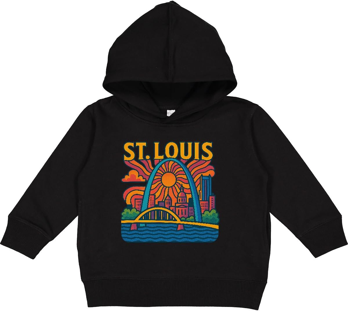 Celebrate the vibrant spirit of St. Louis with this retro-style design featuring the iconic Gateway Arch and cityscape. Perfect for lovers of urban landscapes and those with a special connection to this historic city. Add a splash of color with this standout Toddler Hoodie.