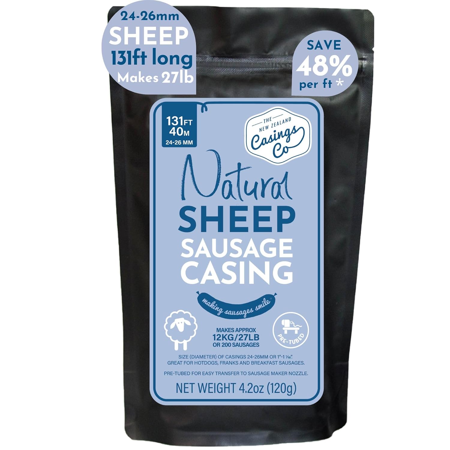- THE NEW ZEALAND CASINGS CO is 100% owned and operated in New Zealand by a family who respect the age old craft of natural sausage casings and passionate sausage makers.- CASING FOR SAUSAGE MAKING: These are edible, natural sheep casings for sausage making (sausage skins) made from sheep intestines specifically designed for home sausage making. - PRODUCT FORMAT: 7 x 32ft long pieces of sausage casings (131ft long total) threaded onto soft tubes for easy transfer from tube to sausage nozzle.- PRODUCT SIZE: A Grade Uniform 24/26mm. Your sausage will be 24-26mm or about 1” diameter once casing filled/stuffed. About the size of a Quarter.- UTILISATION: As a guide, with this 229ft product you can make a total of approximately 48lb of sausages or appx 360 sausages.- NO 'SHORTS' GUARANTEE: We are proud to have a no 'shorts' guarantee. Shorts are the casing off-cuts that can be as short as 2ft that some manufacturers cheekily package up and sell off to home sausage makers.- TYPES OF SAUSAGES: Our edible sausage casings are great for any type of sausage including breakfast sausage, hot dog, franks, chorizo, chipolata, merguez, hot links, chicken, pork, venison, lamb, beef or halal sausages. Suitable for fresh or cured sausages and smoking. - GREAT HOT DOG CASINGS: If you’re looking for natural casing hot dogs you’ve come to the right place! Traditionally a hot dog or frankfurter had to be made with a 24-26mm natural sheep casing to be legally called a hot dog. So our casings are the perfect size.- SOURCE: 100% sourced, processed and dispatched from New Zealand.-USAGE: Please soak casings in warm water (99F - body temp) for minimum 45mins before use and use a 0.5" nozzle on your sausage stuffer.- SHELF LIFE: Our products have a 12 month shelf life. They will last their full life, even if opened, as long as storage and usage instructions are followed