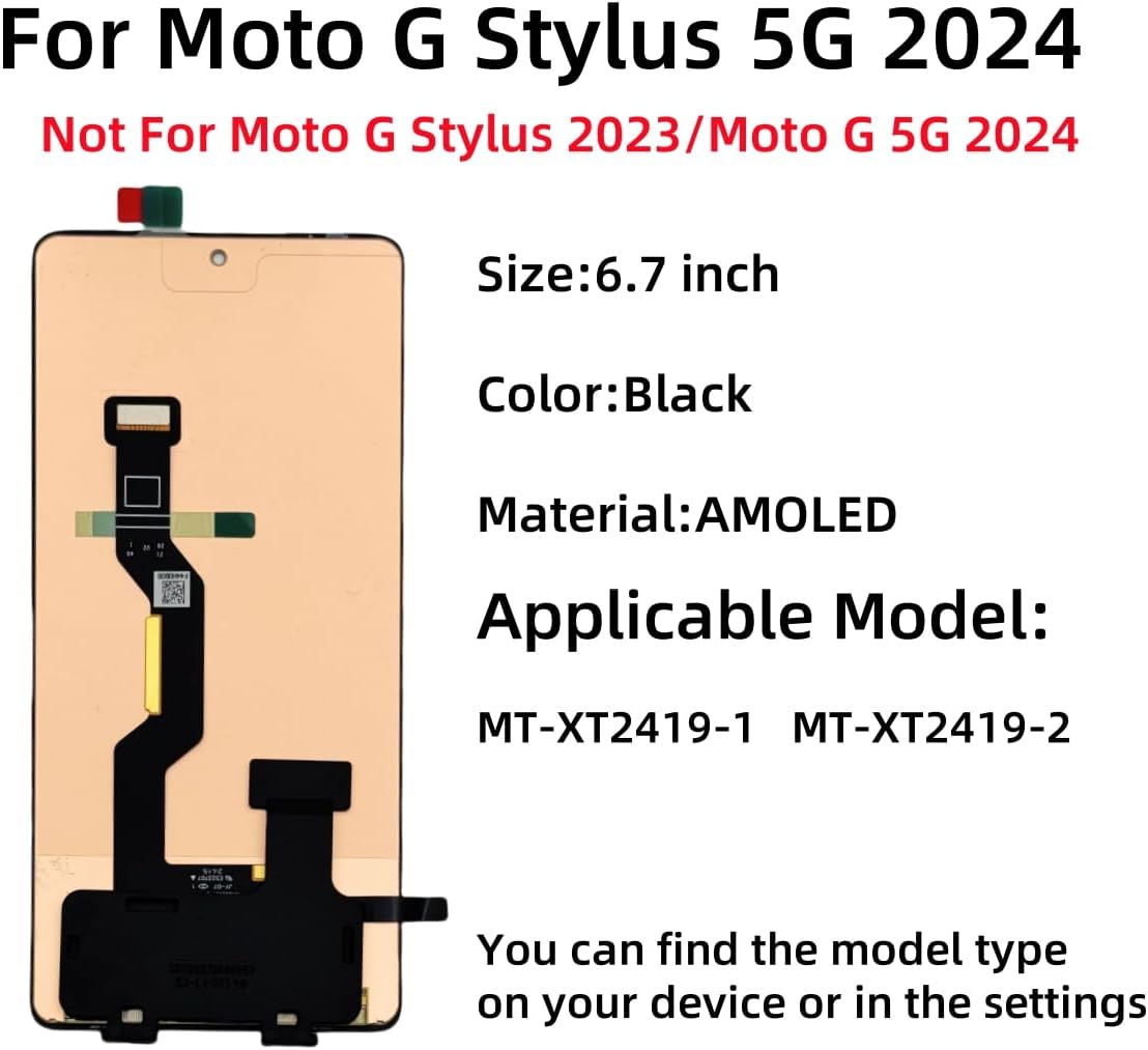Full Testing before Installation: For Motorola G Stylus 5G 2024 LCD screen undergo rigorous testing before shipping to ensure you receive a high-quality product. Note: Handle the LCD screen gently to avoid any damages. Improve your device with our OLED Screen for Moto G Stylus 5G 2024 – a precise LCD Screen Replacement specifically designed for moto G Stylus 5G 2024 XT2419-1 XT2419-2 XT2419-3. This screen touch digitizer display assembly replacement possesses a generous 6.7" (2024) size, guaranteeing an immersive viewing experience. Equipped with a high resolution of 2400×1080, a fast 120Hz refresh rate, and a 240Hz touch sampling rate, this OLED screen brings dynamic and smooth visual performance. Its peak brightness of 1200nit ensures excellent visibility in bright conditions, and the screen fingerprint recognition feature adds an extra layer of safety and convenience. Revamp your G Stylus 5G 2024 with our LCD Screen Replacement, perfect for restoring the original display performance of your device. Enjoy a new beginning with this high-quality, compatible, and easy-to-install replacement screen. Full Testing before Installation: For Motorola G Stylus 5G 2024 LCD screen undergo rigorous testing before shipping to ensure you receive a high-quality product. Note: Handle the LCD screen gently to avoid any damages. Important 1.This is New Original LCD Screen replacement for Motorola Moto G Stylus 5G 2024 . 2.This screen only fit for Moto G Stylus 5G 2024 XT2419-1 XT2419-2 XT2419-3. 3.This for Moto G Stylus 5G 2024 used to replace old brocken screen. 4.This for Moto G Stylus 5G 2024 screen includes a professional full set of repair tools. Package Included: LCD screen for Moto G Stylus 5G 2024 x 1 Battery adhesive x1 Back cover adhesive x1 SIM eject pin x1 Screwdriver +2.0 x1 Screwdriver +1.6 x1 Screwdriver -2.0 x1 Nylon plastic spudger opening tool pry bar x1 Triangle metal pry pieces openers x1 Suction cup x1 Tweezers x1 Clean Alcohol Wipe x1 Rubber band x6 After-Sales Service We provide 24 hours quick reply,If you are not 100% satisfied with our product ,please fell free to contact us via Amazon and will be our pleasure to serve you.