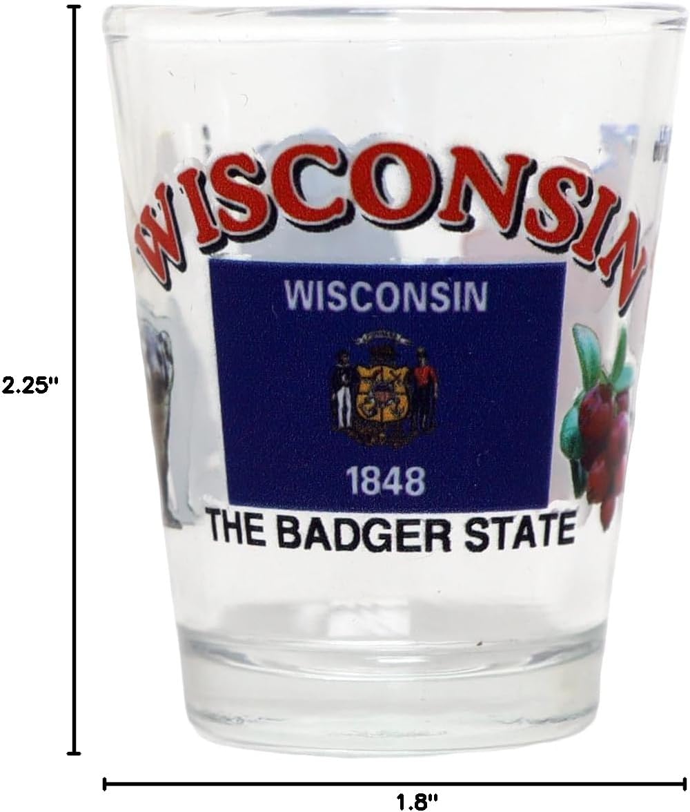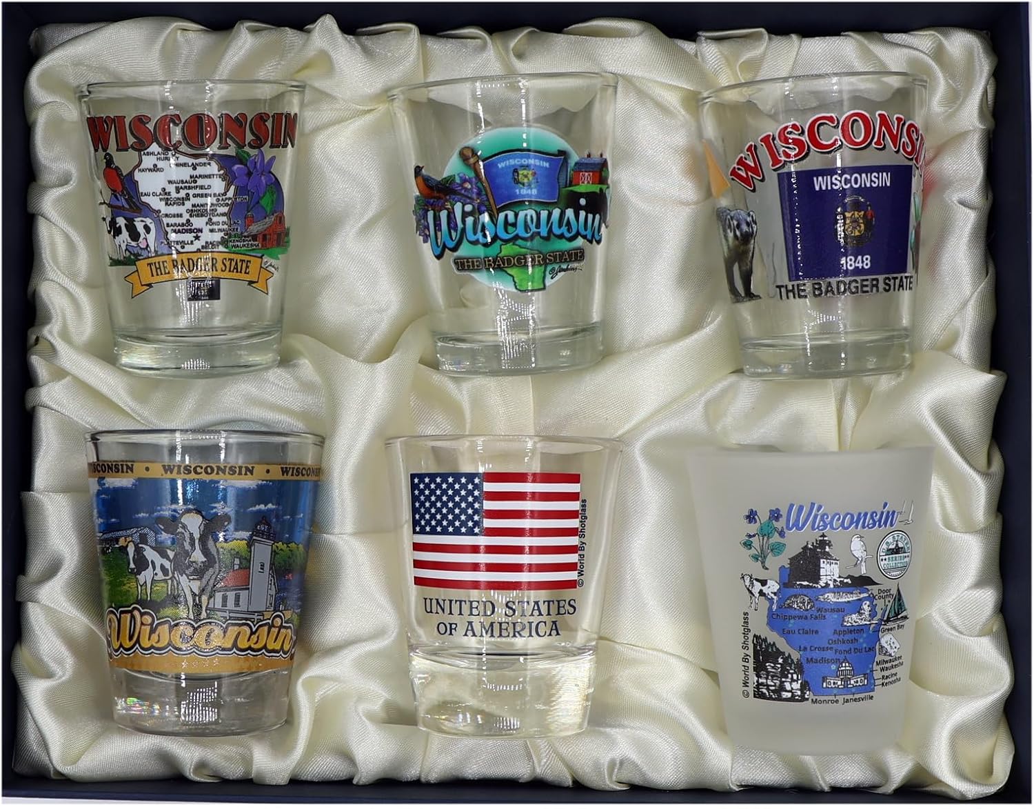 Here is a very rare and hard to find souvenir collectible Wisconsin United States USA Souvenir Boxed Shot Glass Set (Set of 6). It is a 5x6cm style shot glass boxed set, each glass measuring 2.25 inches tall and 1.8 inches in diameter.